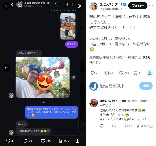 人気インフルエンサー・ききまるさん(27)との離婚を発表したお笑いコンビ「Gパンパンダ」の一平さん(32)が、2024年10月21日にXを更新。後輩芸人の「金の国」渡部おにぎりさんから幸せそうな写真が送られてきたとして、「本当に悔しい、情けない、やるせない」と吐露した。