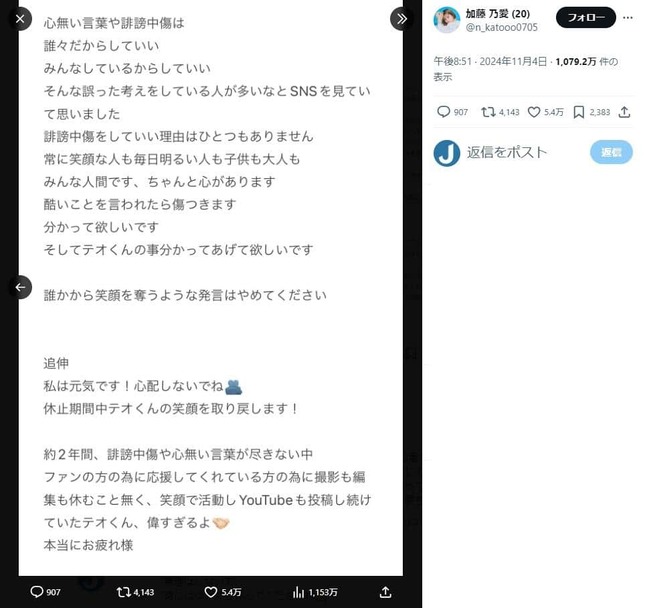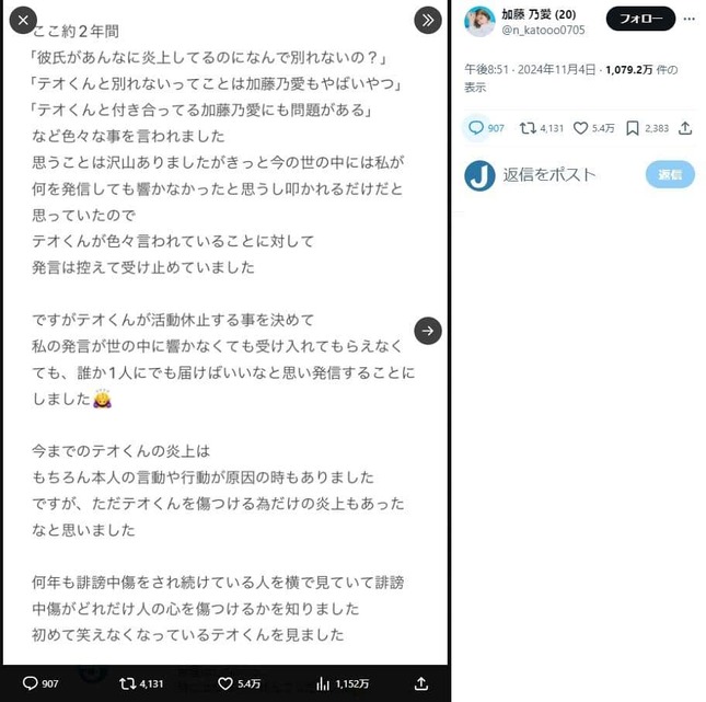 加藤さんは、テオさんの活動休止が発表された4日にXを更新。約2年間にわたり、「彼氏があんなに炎上してるのになんで別れないの?」「テオくんと別れないってことは加藤乃愛もやばいやつ」などと言われてきたと明かした。これに思うところはあったものの、「叩かれるだけだと思っていた」として、発言は控えていたという。しかし、テオさんの活動休止を受け、「誰か1人にでも届けばいいな」と思い、コメントを発表することにしたという。