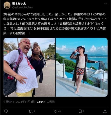 バラエティー番組「進ぬ!電波少年」(日本テレビ系)の企画で人気を博したお笑い芸人の坂本ちゃん(58)が2024年11月4日、Xで20キロ減量したビフォーアフターの姿を披露した。