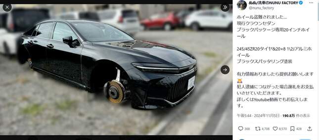 出張先の大阪で被害を知ったぬぬさんは、スタッフに警察へ通報するよう指示。次に保険会社および、車両の引き上げをするために修理工場へ連絡し、盗まれたホイールが品番管理されていないかトヨタ販売店に問い合わせたと説明した。ちなみに、今回盗まれた20インチのホイールは「pcd120」という希少なものだったという。
