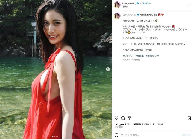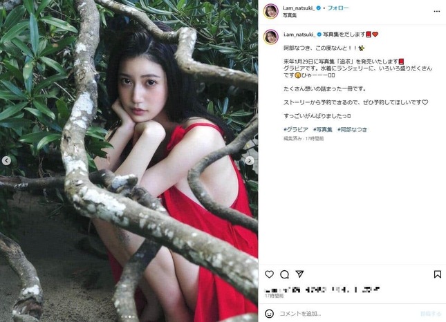 25日になって、阿部さんはインスタで「来年1月29日に写真集『追求』を発売いたします グラビアです。水着にランジェリーに、いろいろ盛りだくさんです ひゃーーー」と発表している。