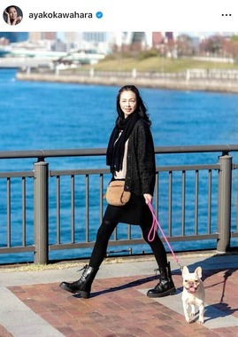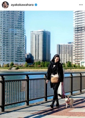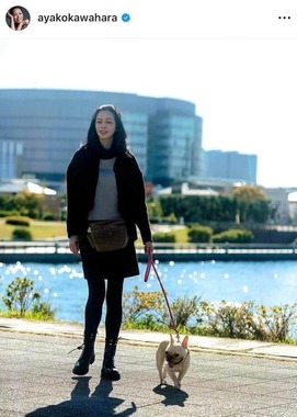 川原さんは、「豊洲を散歩しました」といい愛犬と一緒に散歩をする姿を公開した。