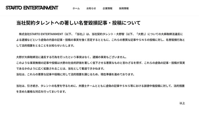 STARTO ENTERTAINMENTは30日、公式サイトを通じて「当社契約タレント・大野智(以下、『大野』)についての大麻取締法違反による逮捕などという虚偽の内容の記事・投稿の事実を強く否定するとともに、これらの悪質な記事やSNSの投稿に対し、名誉毀損行為として法的措置をとることをお知らせいたします」と発表した。