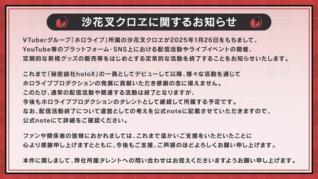 VTuber事務所「ホロライブプロダクション」所属のVTuber・沙花叉クロヱ(さかまたくろえ)さんが2024年11月29日、配信活動やライブイベントの開催などの「定常的な活動」を終了すると発表した。