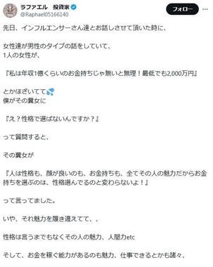 ラファエルさんは「いや、それ魅力を履き違えてて、、」と、あきれたようにつづり、「性格は言うまでもなくその人の魅力、人間力etc」「そして、お金を稼ぐ能力があるのも魅力、仕事できるとかも諸々」と続けた。