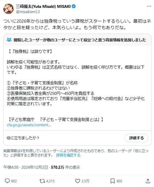 一方、3日時点でこのポストには、誤解を招く可能性がある記述に対してユーザーが背景情報を追加する「コミュニティノート」がついており、そこには「『独身税』は誤りです」「いわゆる『独身税』は正式名称ではなく、誤解を招く呼び方です」と指摘されていた。