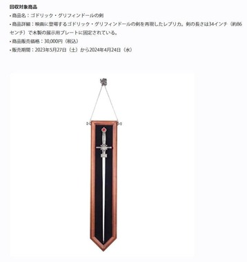 長さ約86センチの「ゴドリック・グリフィンドールの剣」は、23年5月から24年4月にかけて、3万円で販売されていたものの、販売終了後に銃刀法違反となる可能性が浮上した。施設側は回収と返金の対応を行うことを発表している。
