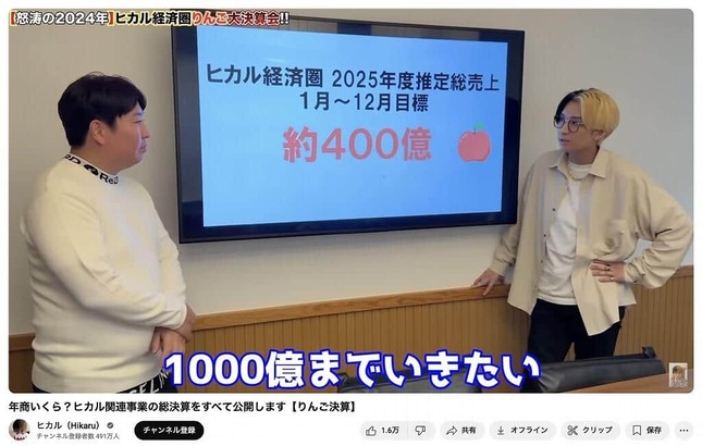 YouTuberのヒカルさんが、2024年12月20日に自身の公式YouTubeチャンネルを更新。「年商いくら?ヒカル関連事業の総決算をすべて公開します【りんご決算】」と題した動画で、2024年の「年商」を公開した。