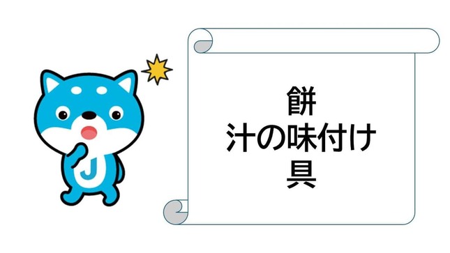 【具】その地方の海の幸、山の幸が使われている。にんじん、大根、ネギなどのほか、東北地方なら山菜やきのこ、千葉県では青のり、広島県では特産のかきが入っている。