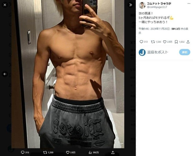 10月には、韓国のボディビルのコンテスト出場時のバキバキに仕上がった全身ショットを公開し、「すごい肉体美」「こんな48歳いないです」「彫刻的な体」と絶賛された。