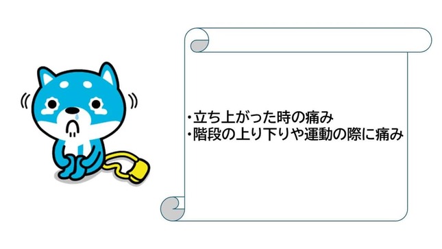 初期の症状は、立ち上がった時の痛みだろう。さらに階段の上り下りや運動の際に痛みを感じ、症状が進むと、じっとしていても痛みを感じたり、夜中にうずいたりするようになる。末期症状としては、歩けない、寝ていても痛むようになる。