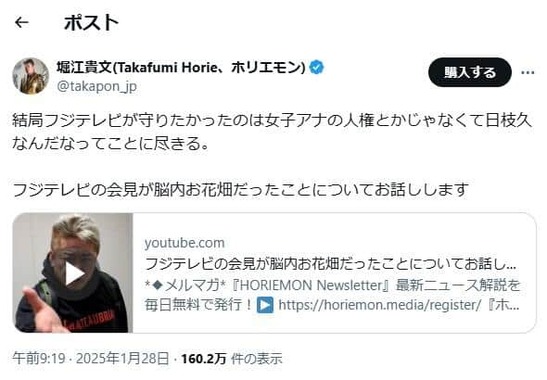 堀江氏は28日、「結局フジテレビが守りたかったのは女子アナの人権とかじゃなくて日枝久(編注:フジサンケイグループ代表で取締役相談役)なんだなってことに尽きる」とXに投稿した。