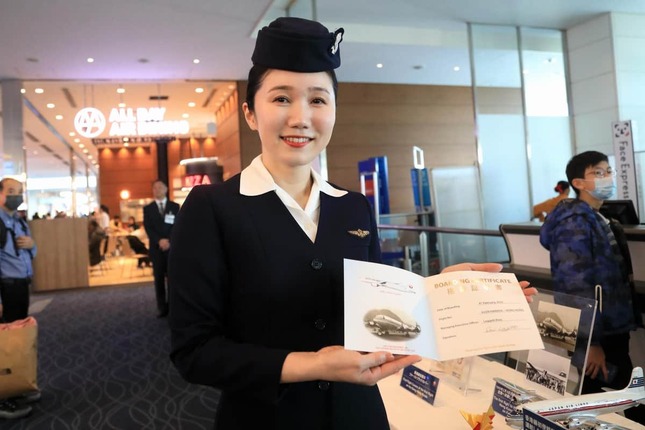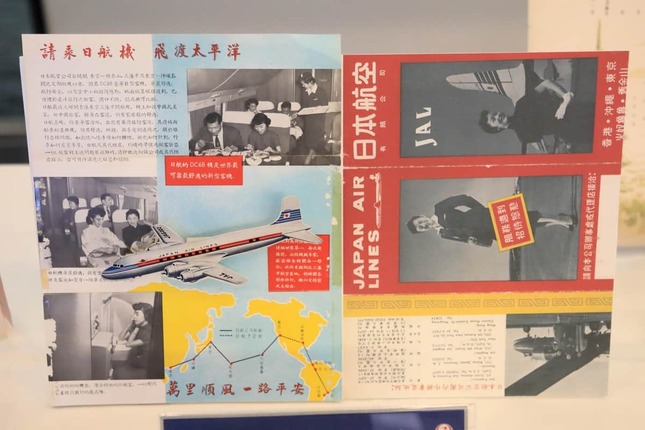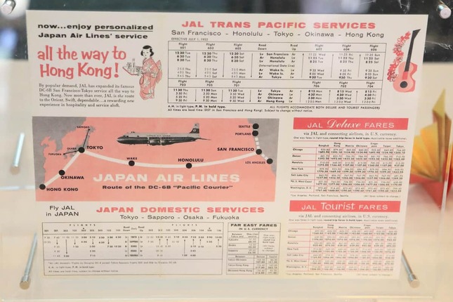 搭乗ゲートには就航時の資料も展示されており、中国語版の案内には「請乗日航機 飛渡太平洋」(太平洋を横断するJAL便をどうぞ)。香港から東京、そしてハワイ、サンフランシスコに乗り継ぐことが想定されていたことが分かる。