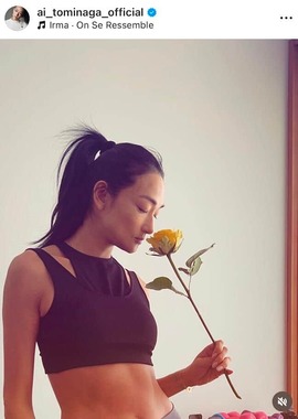 インスタグラムに投稿された写真では、黒のハーフトップにグレーのパンツを着用。室内のトレーニングスペースのような場所で撮影されている。パンツのポケットに手を入れてポーズをきめたショットや、黄色い花を手に、香りをかぐようなショットを披露していた。