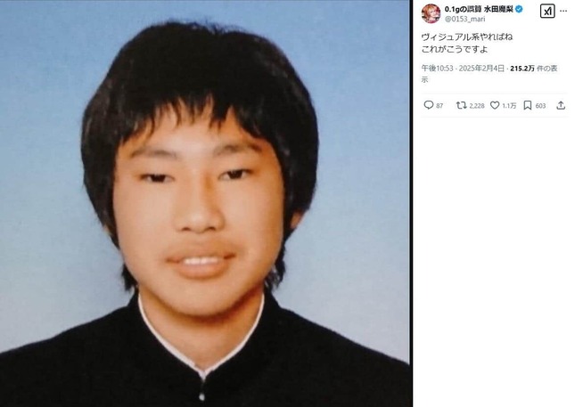 ヴィジュアル系バンド「0.1gの誤算」ギタリストの水田魔梨(みずた・まり)さんが、2025年2月4日にXを更新。学生時代の写真と近影を比較した画像を公開した。