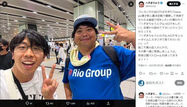 へずまさんはこれを受け、同日にXに谷口さんとのツーショット写真を投稿。「フースーヤの谷口やばすぎだろwww」と反応した。