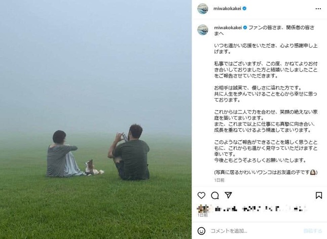 投稿文では「私事ではございますが、この度、かねてよりお付き合いしておりました方と結婚いたしましたことをご報告させていただきます」と発表した。下記のようにもコメントしている。