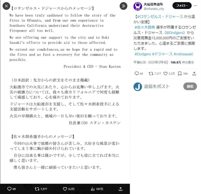 佐々木選手から寄付のほか、所属球団のドジャースも1500万円の災害見舞金を送ったことが、4日に市公式Xで明かされた。佐々木選手は「今回の山火事で故郷の皆さんが苦しみ、大好きな風景が変わってしまう事に胸が締め付けられています。自分に出来ることは僅かですが、少しでも役に立てれば本当に嬉しく思います」とコメントを寄せた。