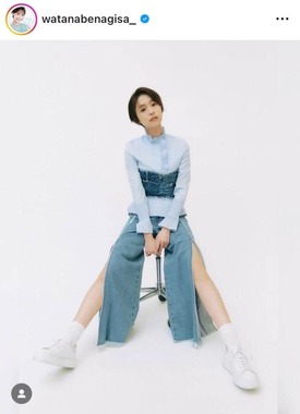 この日は「デニム。新鮮!」とだけつづった渡邊さん。公開された写真は、すらりとした美脚がのぞく、個性的なデニムのショット。椅子に座ってポーズを決めていた。