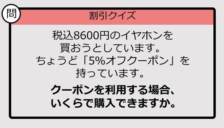 割引クイズクーポンやキャンペーンでお得に買い物ができる時、割引の計算がパッとできたら便利ですよね。毎日のスキマ時間に暗算力を鍛えておくといいかもしれません。まずはこの問題にチャレンジしてみましょう。税込8600円のイヤホンを買おうとしています。ちょうど「5%オフクーポン」を持っています。クーポンを利用する場合、いくらで購入できますか。↓↓↓正解は......8170円