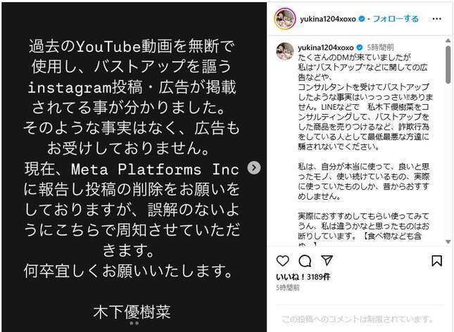 元タレントでYouTuberの木下優樹菜さんが2025年3月12日にインスタグラムを更新し、自身の動画を無断使用したバストアップ広告に再度注意喚起を行った。