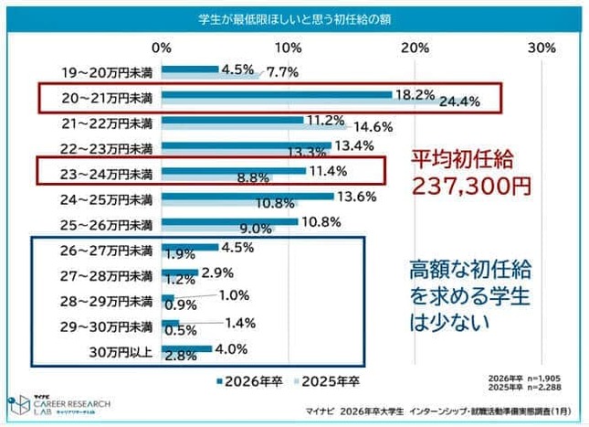 賃上げの動きが盛んな現在、学生はこの状況をどうとらえているのか。学生に最低限ほしいと思う初任給の額を聞くと、最も回答が多いのが「20~21万円未満」と、平均初任給額23万7300円より低い額だった【図表1】。