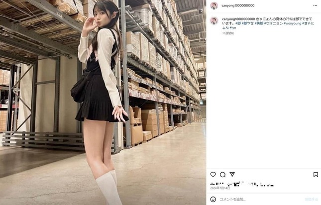 きゃにょんさんは24年7月14日に「きゃにょんの身体の73%は脚でできています」とミニスカ写真を公開し、「スタイル良すぎ」などと注目されたこともある。