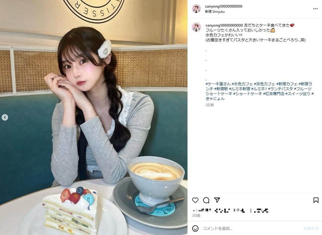 今回インスタでは、東京・新宿のカフェを訪れたとして「友だちとケーキ食べてきた フルーツたくさん入っておいしかった 水色カフェかわいい」と投稿。続けて、