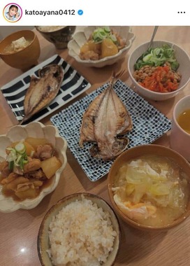 インスタグラムに投稿された写真を見ると、ご飯、味噌汁、納豆、アジの開きや煮物などの献立が並ぶ。