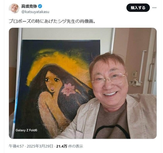 高須氏は「プロポーズの時にあげたシヅ先生の肖像画」として、長い髪に花を飾ったシヅさんを描いた作品とのツーショットを添えた。