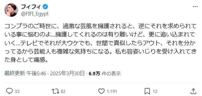 タレントのフィフィさんが2025年3月30日にXを更新し、29日に放送された「オールスター感謝祭'25春」(TBS系)で物議を醸したお笑いタレントの江頭2:50さんの暴走騒動に言及した。