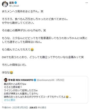 皇治選手とたびたびSNS上で舌戦を繰り広げている格闘家の平本蓮選手は31日、報道を引用し「試合では当て逃げした事ないのに...」と皮肉をポツリ。「午前3時半に車が大破するレベルの事故でその場から逃走はそれ兄さん飲酒運転だったんじゃ...」と疑惑もつづった。