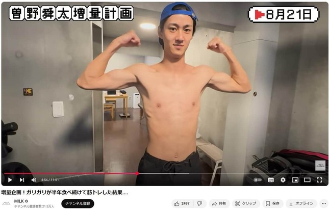 5人組ダンスボーカルグループ「M!LK」(ミルク)が、2025年3月28日に公式YouTubeを更新。メンバーの曽野舜太さんの「増量企画」を公開した。
