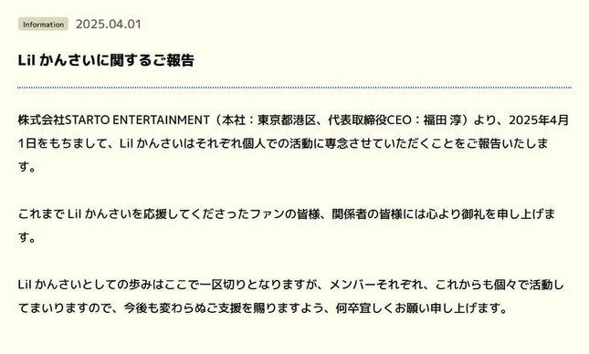 STARTO社は4月1日、「Lil かんさいに関するご報告」を公開。「2025年4月1日をもちまして、Lil かんさいはそれぞれ個人での活動に専念させていただくことをご報告いたします」と解散を発表した。