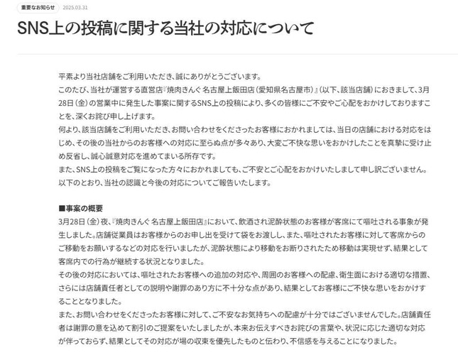 同社は、「嘔吐されたお客様への追加の対応や、周囲のお客様への配慮、衛生面における適切な措置、さらには店舗責任者としての説明や謝罪のあり方に不十分な点があり、結果としてお客様にご不快な思いをおかけすることとなりました」と認めている。