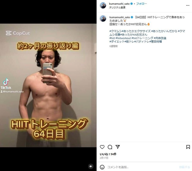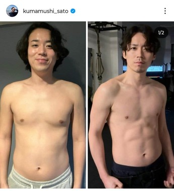 「あったかいんだからぁ」の歌ネタで知られるお笑いコンビ「クマムシ」の佐藤大樹さんが、2025年3月30日にXとインスタグラムを更新。10キロの減量に成功したことを報告し、ビフォーアフター写真を公開した。