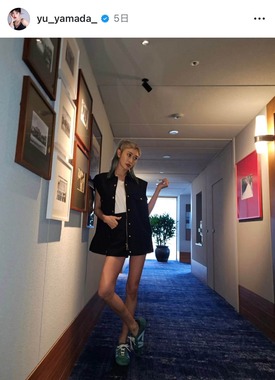 インスタグラムに投稿された写真で、金髪の山田さんが黒のジャケットとショートパンツ、白のTシャツを着用していた。両手をポケットに入れ、脚をクロスさせたポーズや、三角座りをしたショットなども披露している。