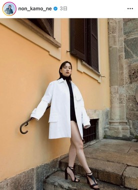 インスタグラムに投稿された写真では、白のコートと、ミニ丈の黒のタイトなワンピースを着用。全身ショットや手すりをつかんで脚をクロスさせたり、壁に手をついたりしたポーズをし、クールな表情を見せた。