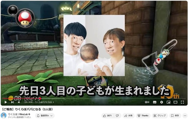 チャンネル登録者数71万人超の人気YouTuber・りくらぼさんが、2025年4月10日にチャンネルを更新。第3子が誕生したことを報告した。