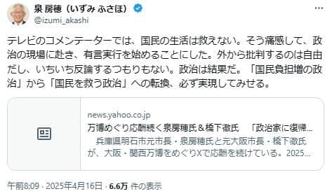 兵庫県明石市の元市長・泉房穂氏が2025年4月16日にXを更新し、元大阪市長の橋下徹氏と繰り広げている大阪・関西万博に関する議論を振り返り、あらためて自身の思いを明かした。