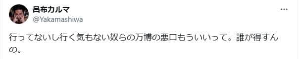 Xでは「そうだそうだ 新幹線だって乗れなきゃ高速道路だって使えないし 」「国道は役に立ってる。万博はただの無駄遣い。雰囲気だけ 」「わざわざバビロン側の意見発信するようになったんすね笑笑笑笑 」などと書き込まれている。