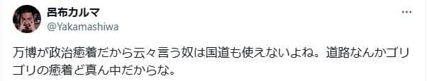 そして16日、呂布さんは「万博が政治癒着だから云々言う奴は国道も使えないよね。道路なんかゴリゴリの癒着ど真ん中だからな」「一生獣道歩いてろ」と改めて持論を展開。