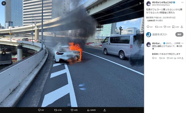 ポケカメンさんは、「社長がフェラーリ買ったらしいから乗せてもらった1時間後に燃えた」と投稿。自身がフェラーリの前に立つ出発前とみられる写真と、フェラーリが首都高とみられる路上で燃え、黒い煙が上っている写真も添えた。