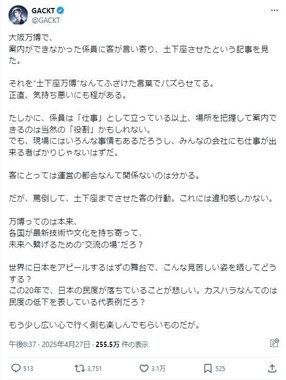 GACKTさんはXで、「案内ができなかった係員に客が言い寄り、土下座させたという記事を見た」としてこれに言及。「"土下座万博"なんてふざけた言葉でバズらせてる」とし、「正直、気持ち悪いにも程がある」と非難した。