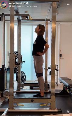 インスタグラムに投稿された動画では、黒いTシャツとグレーのパンツを着用。真剣な表情で、チューブを使って、脚を中心にトレーニングをする様子を披露していた。