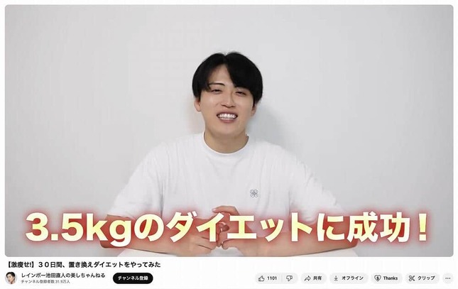 お笑いコンビ「レインボー」の池田直人さんが、2025年5月30日に公式YouTubeチャンネルを更新。「【激痩せ!】30日間、置き換えダイエットをやってみた」と題し、3.5kg減を叶えた置き換えダイエットについて明かした。