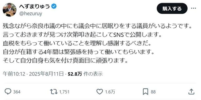 奈良市議会議員に当選した元迷惑系YouTuberのへずまりゅう氏が2025年8月11日、「議会中に居眠りをする議員」への対応をXで宣言した。