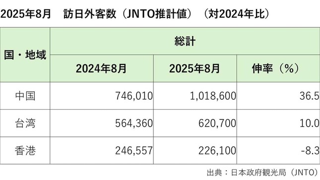 自民党総裁選挙でも外国人問題、オーバーツーリズムはテーマとなったが、外国人別で突出しているのが「中国人」である。日本政府観光局が2025年9月17日に発表した25年8月の訪日外国人旅行者数は342万8000人、8月としては過去最高を更新している。このうち中国本土からの訪日客は101万8600人だった。