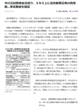 読売新聞が2026年3月30日に公式サイト上で、故・中川昭一元財務・金融相の「酩酊会見」に同紙記者が関与していたかの情報について「事実無根」と発表した。
