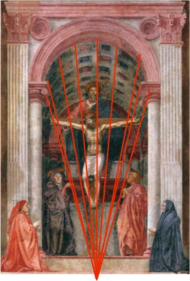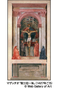 そして「父なる神」「子のキリスト」「精霊(キリストの頭上の白い鳩)」の聖三位一体を、一点透視図法で見事に描きました。